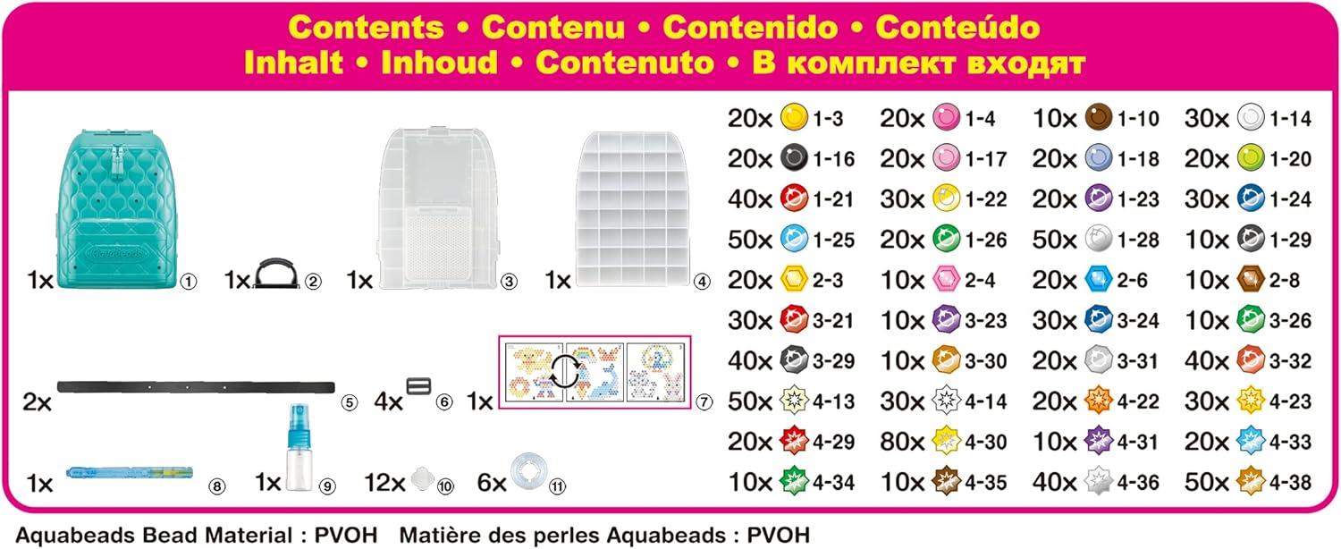 Includes over 1000 solid, jewel, polygon, and star beads in 40 colours, backpack with straps, bead palettes and flip tray, double-sided Aquabeads pen, sprayer, design pegs, 2 template sheets, and instructions.