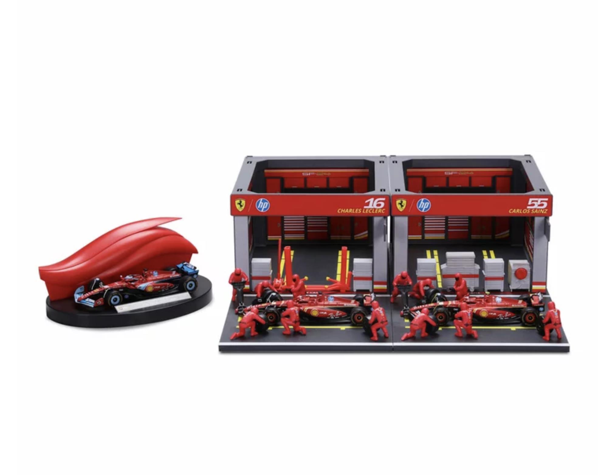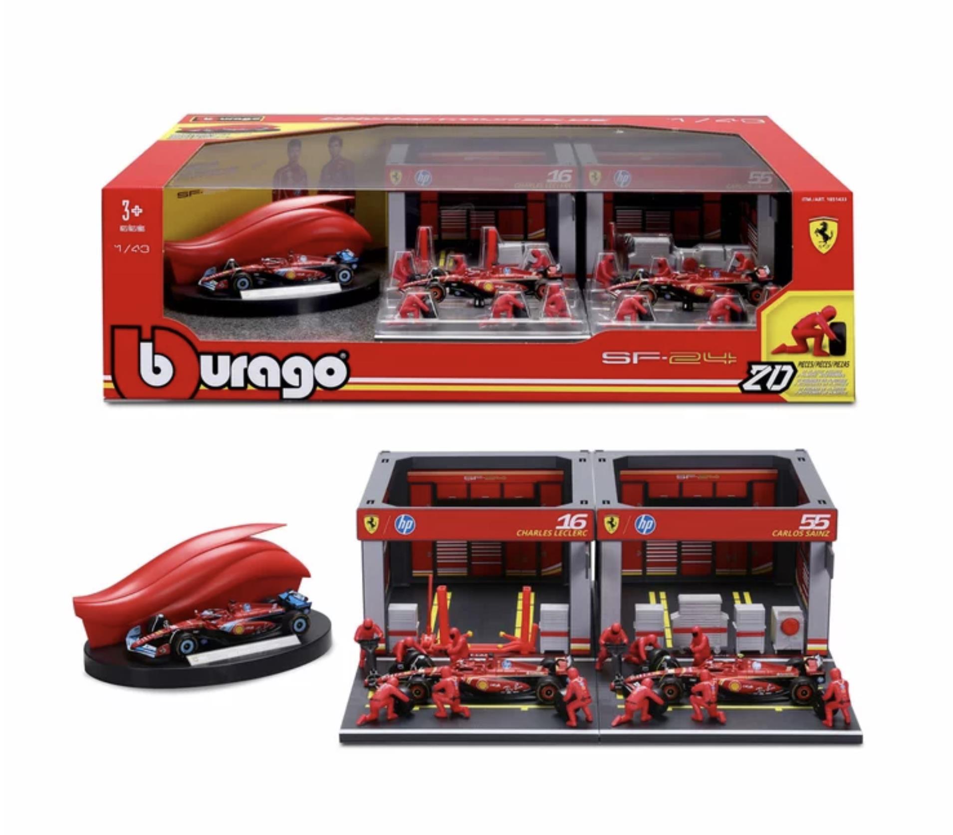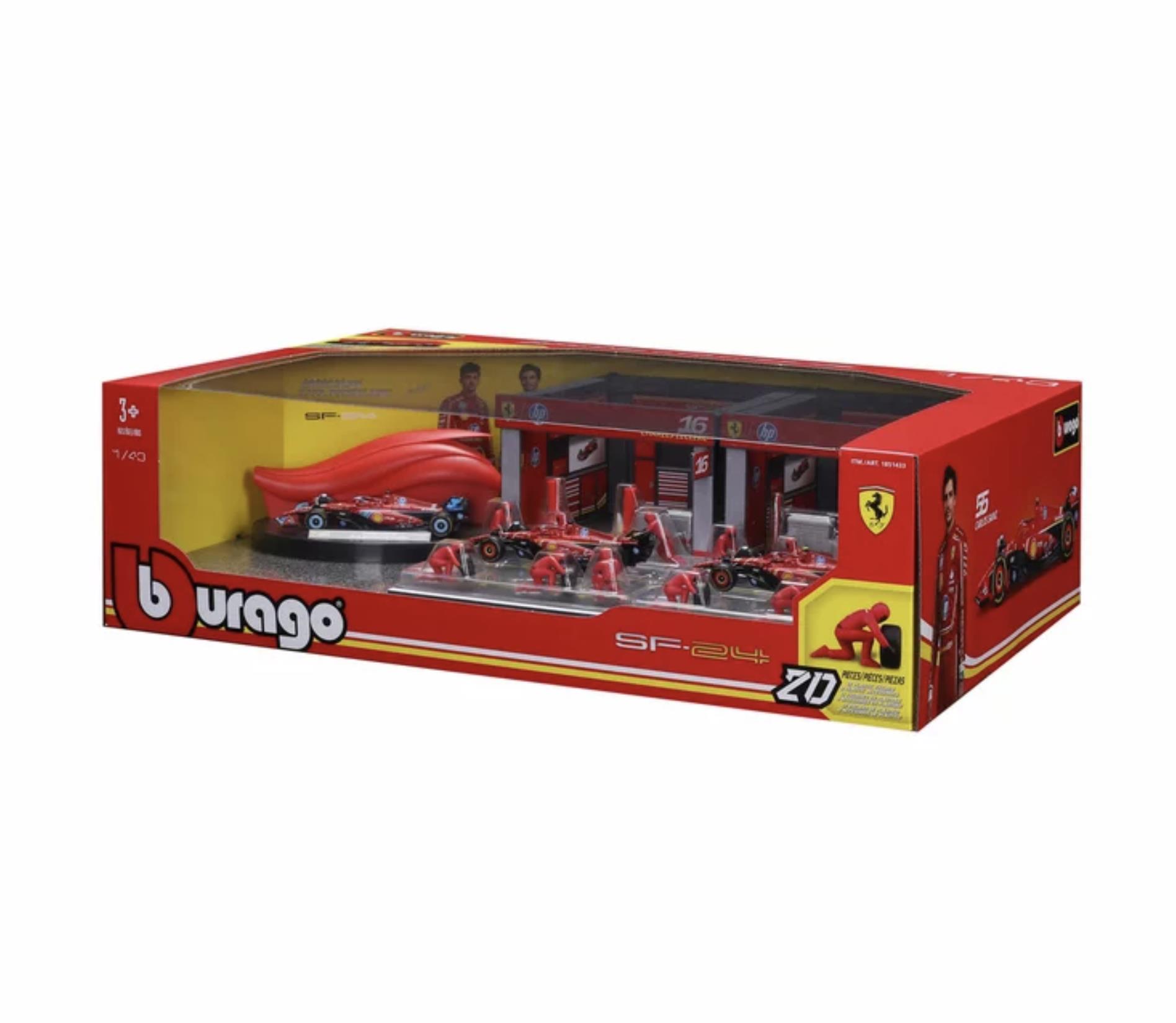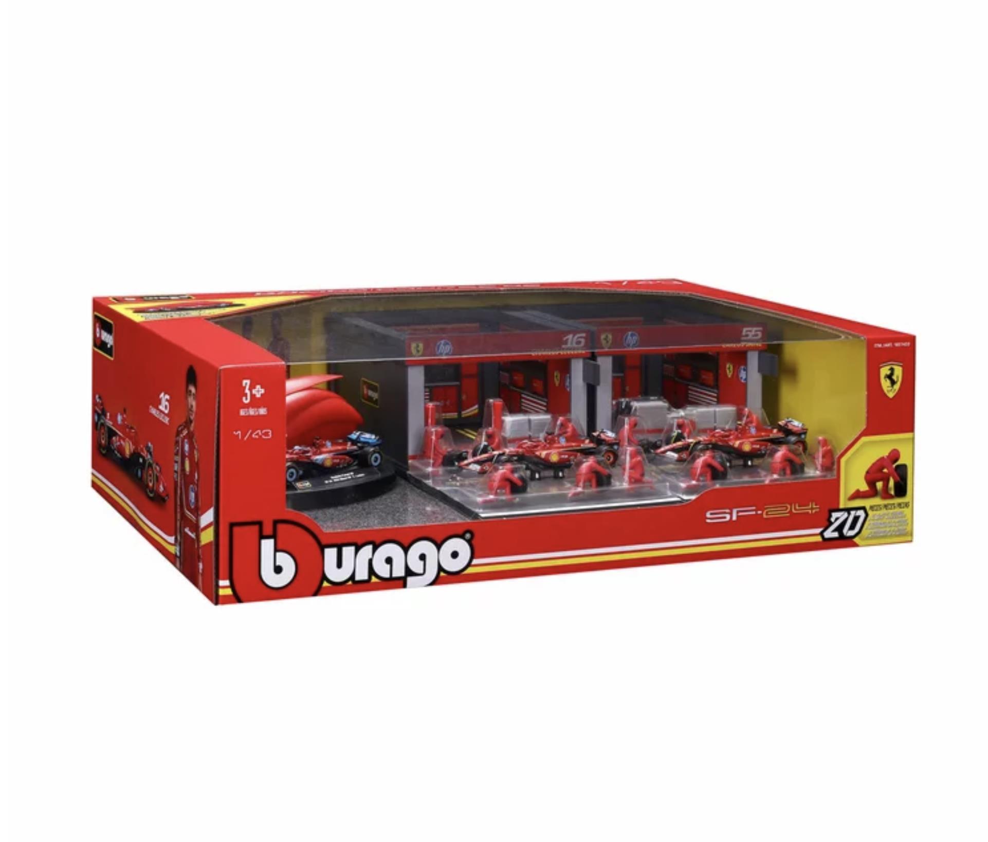 Speed, style, and sleek design — this set includes three officially licensed racing cars in detailed 1:43 scale that roll smoothly into action. The race doesn’t happen without the team! Gear up with 12 pit crew members, ready to refuel, make quick fixes, and keep your cars track-ready. Set up your racing HQ with two detailed pit garages, the perfect home base for your cars and crew.