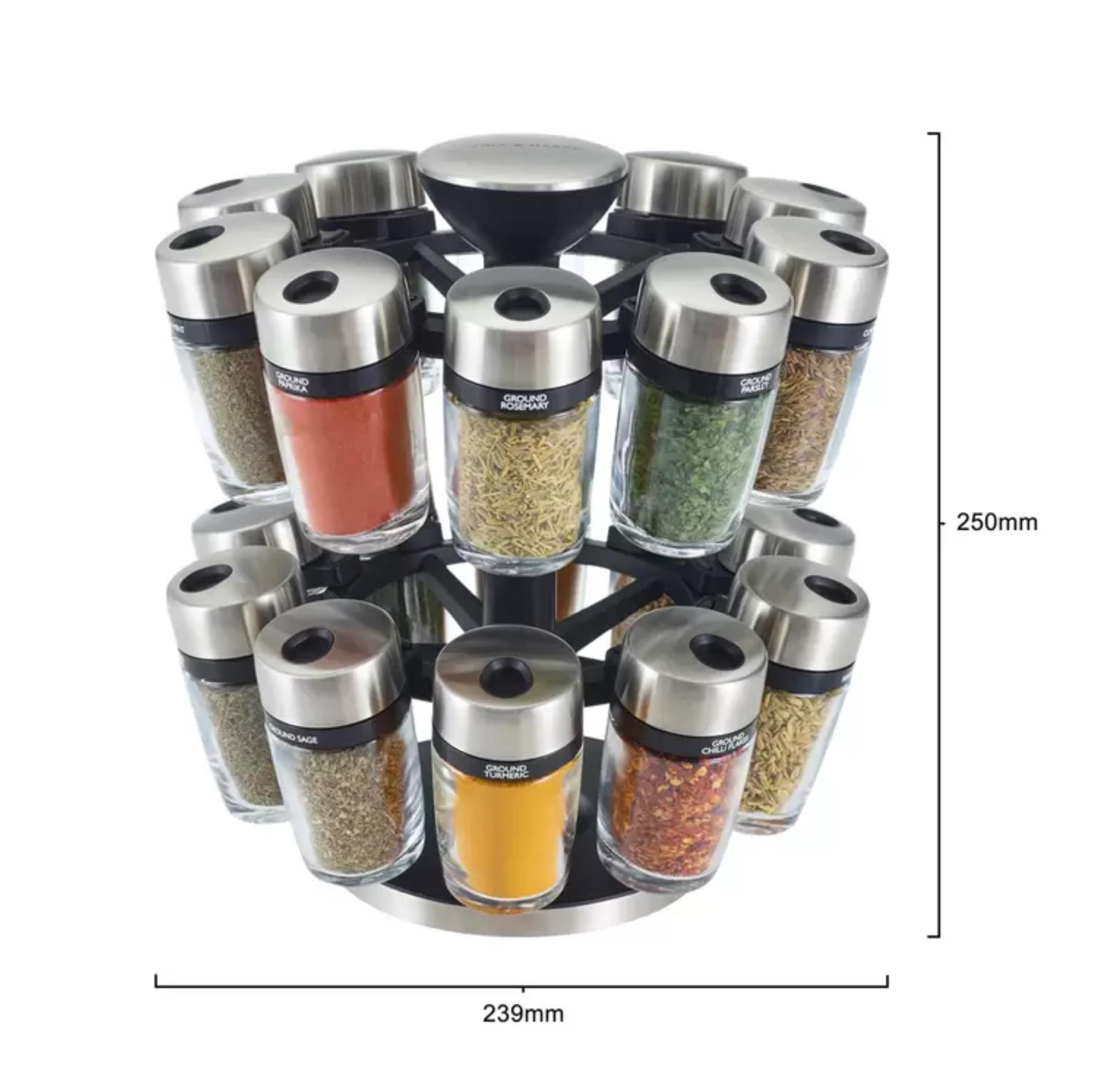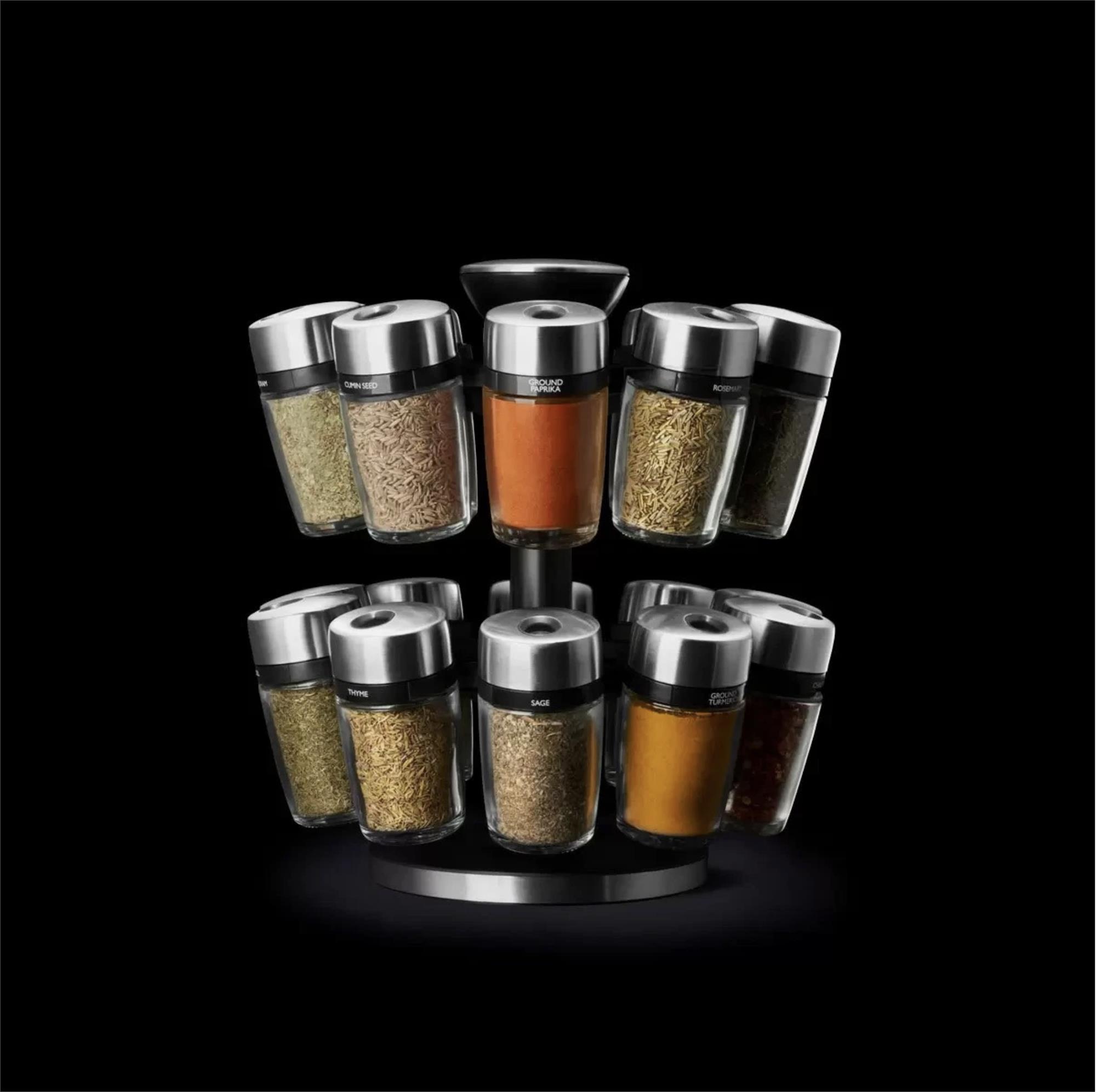 The smooth-spinning carousel features a durable black plastic body with brushed stainless steel accents and a central carry handle, making it easy to rotate or move around your kitchen. Each of the 20 glass jars docks securely into place and lifts out easily when needed.