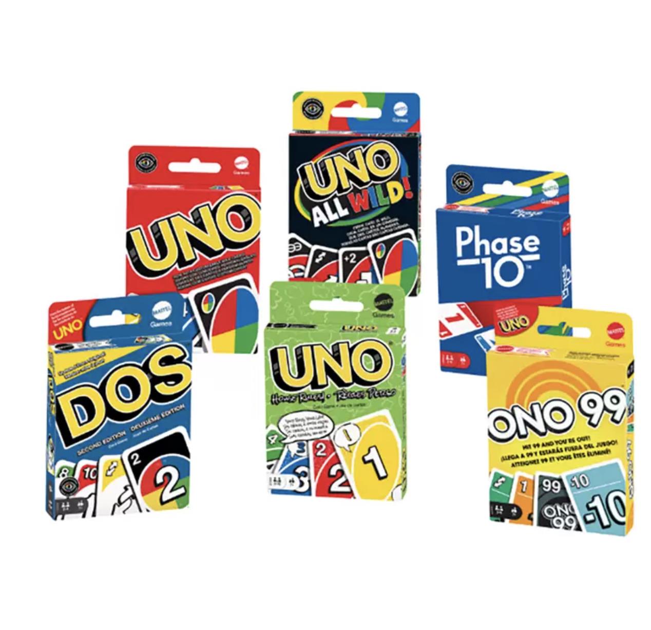 Find six great card games in one convenient mega pack with UNO®, DOS™, Phase 10™, UNO® House Rules, UNO All Wild™ and ONO 99™ together in this bundle. This set has a card game for every player. With so many options to choose from, this six-game set makes a great gift for players 7 years and older who love card gamesFeatures:UNO® is the classic and beloved card game that’s easy to pick up and impossible to put down! As well as all the different variations of UNO! Phase 10®-The object of the game is to be the first player to complete 10 varied phases with two sets of three, one run of seven, or seven cards with the same color. The twist is that each Phase to be completed is specific for each hand dealt.DOS™ involves a race to be the first to get rid of your cards, 2 to 4 players.