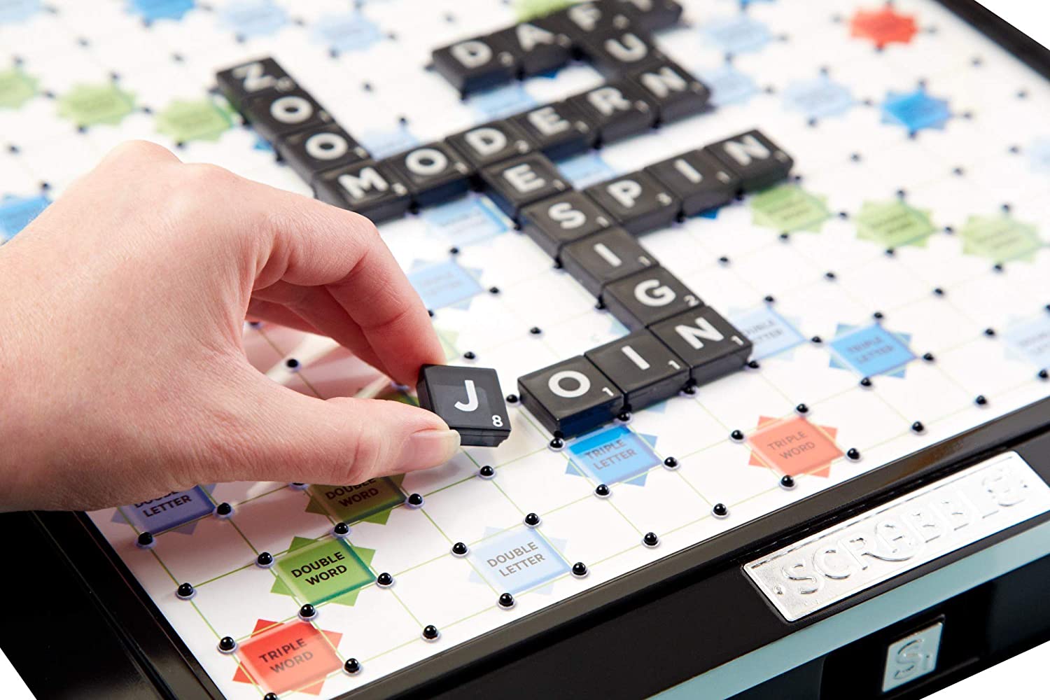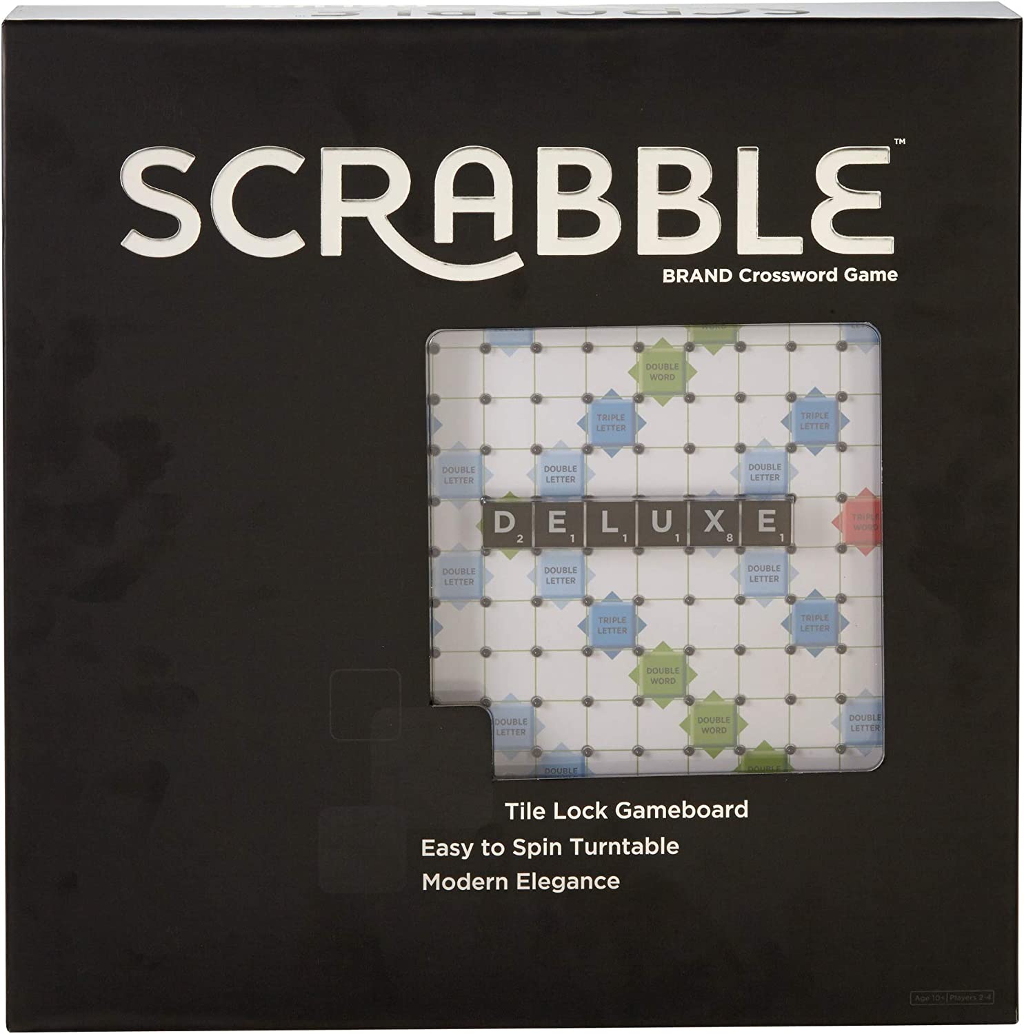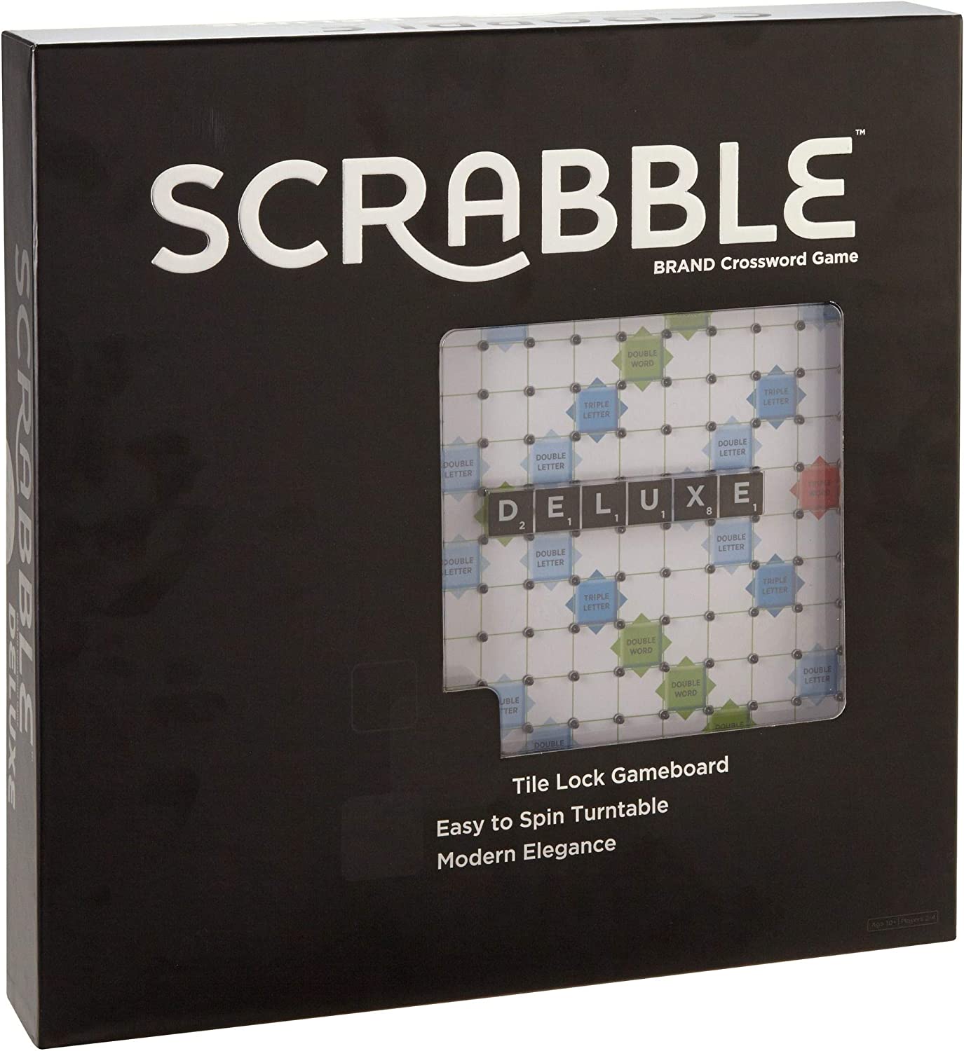 Every word counts when you’re playing this deluxe version of one of the world’s most popular word game. Featuring an elegant board in contemporary colours and chic black styling along with a built-in turntable and storage drawer, Scrabble Deluxe is an ideal combination of sleek looks and improved functionality. Like the classic version, this enhanced edition is for two to four players and the object is to compete for the highest score by forming interlocking words in crossword fashion on the Scrabble board. Tiles display letters with various score values. Earn higher scores by using the tiles in locations and combinations that make the most use of both the letter values and the premium squares. For example, triple-letter score, double-word score on the board earn greater points. Includes game board, rules guide, 100 letter tiles with sleek green pouch and four tile racks.