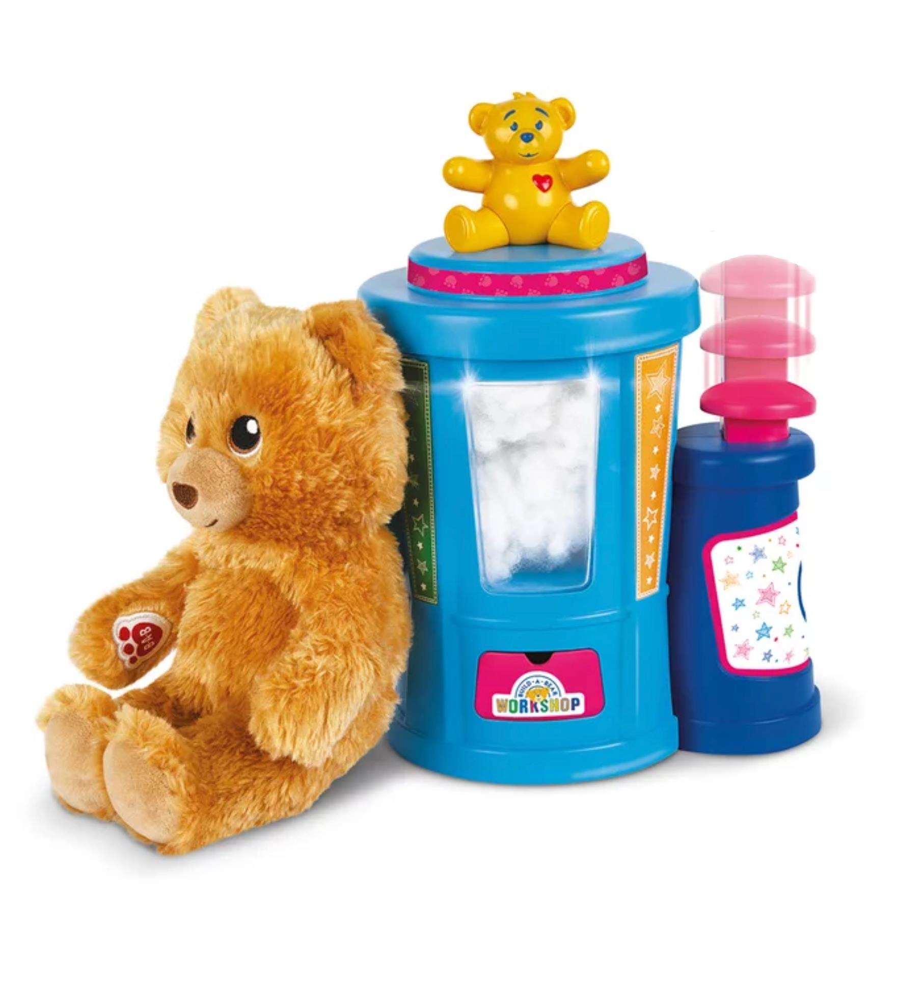 This light-up stuffing machine lets children watch the magic happen as the bears come to life. Simply add the filling, attach a bear to the nozzle, and press the big pink button to fill. Once stuffed, little ones can make a wish on the included heart, place it inside their bear, and complete the experience with a birth certificate and outfit.