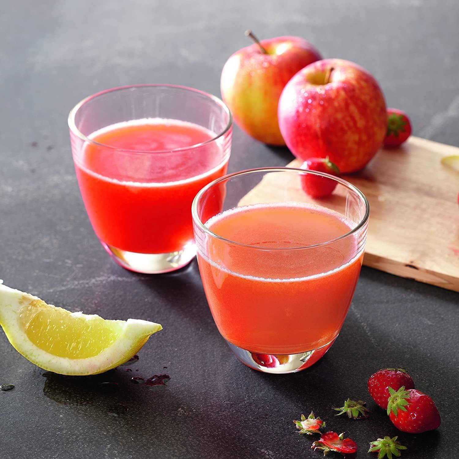 The juicer is designed with round shapes and smooth surfaces to facilitate easy rinsing under the tap.