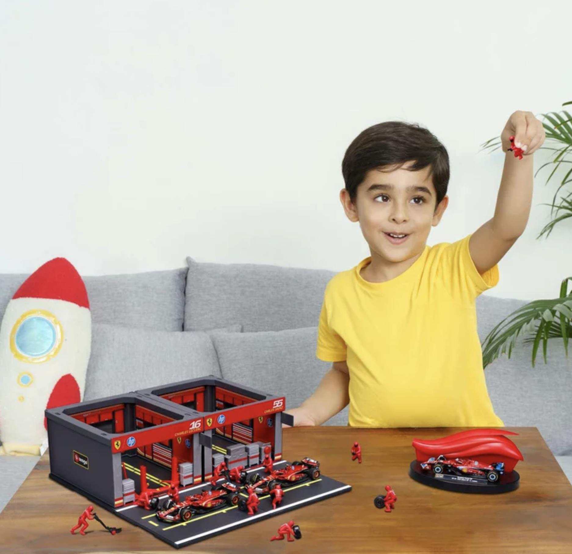 Speed, style, and sleek design — this set includes three officially licensed racing cars in detailed 1:43 scale that roll smoothly into action. The race doesn’t happen without the team! Gear up with 12 pit crew members, ready to refuel, make quick fixes, and keep your cars track-ready. Set up your racing HQ with two detailed pit garages, the perfect home base for your cars and crew.