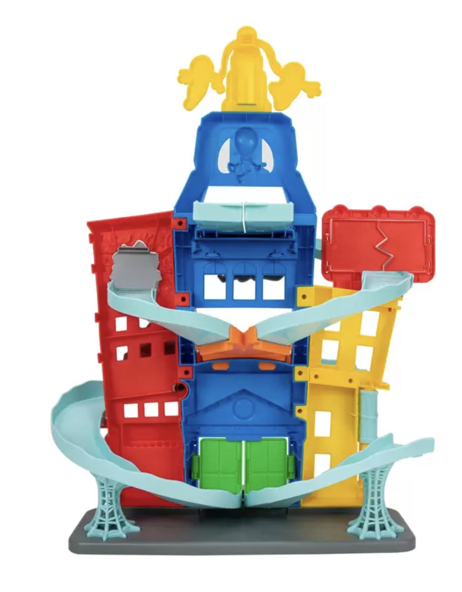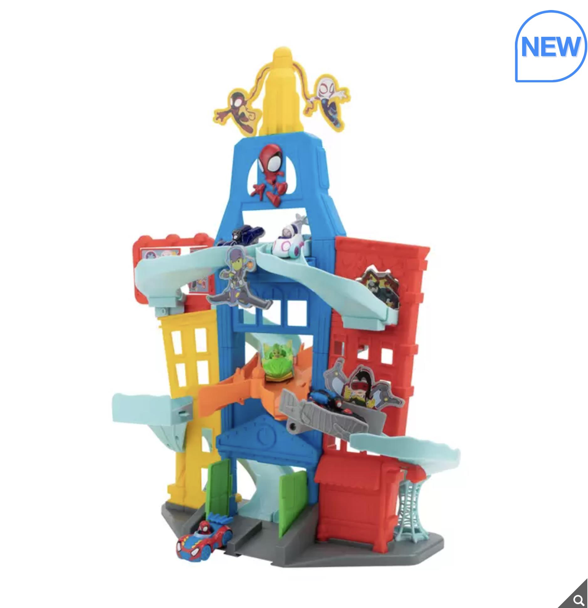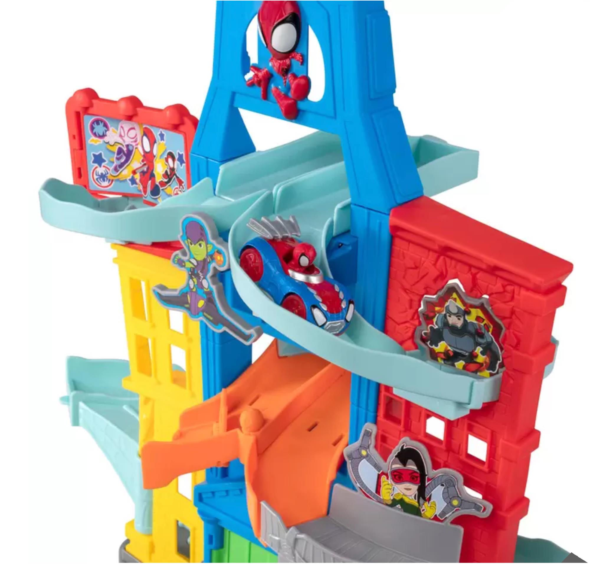 Race into adventure with the Amazing Metals City Track Set. Towering at an impressive 24 inches tall, this multi-level playset features two separate vehicle tracks, nine unique play zones, and six Amazing Metals vehicles: Spidey, Ghost-Spider, Spin, Iron Man, Black Panther, and Electro. Start Spidey and a friend at the dual launcher platform to zoom down the two different tracks.