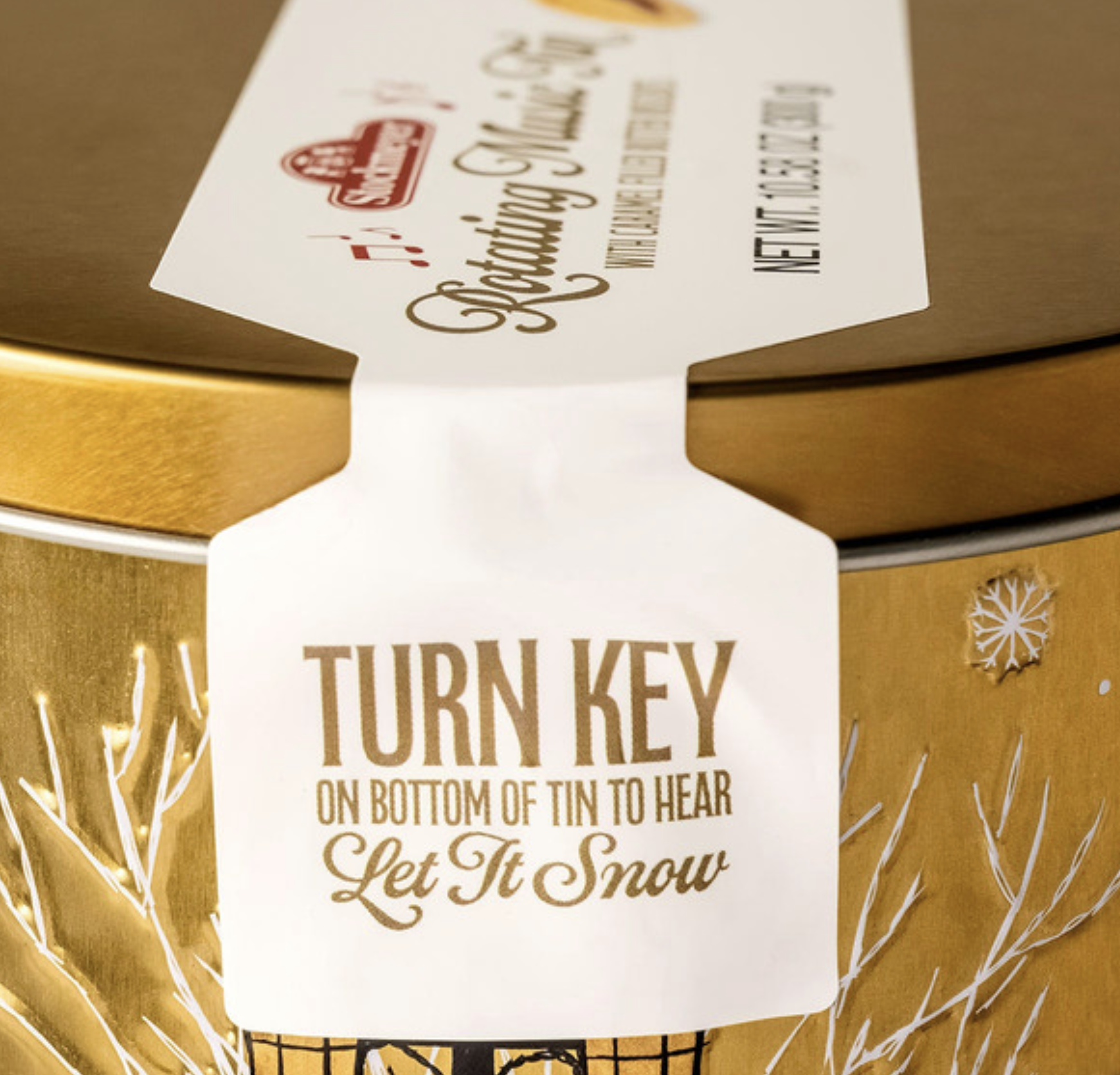 The unique feature of this tin is the rotating musical mechanism. Simply turn the key on the bottom of the tin to enjoy a charming “Let it Snow” rendition as the tin gently rotates.